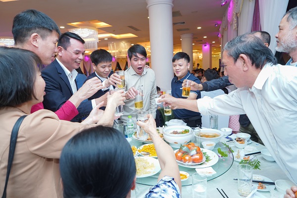 Hòa cùng những trò chơi sôi động là tiếng cụng ly chúc mừng của thành viên công ty tại các bàn tiệc. Món ăn phong phú với ly rượu thơm nồng cùng những nụ trên môi phần nào xua tan đi bao muộn phiền công việc trong một năm qua.