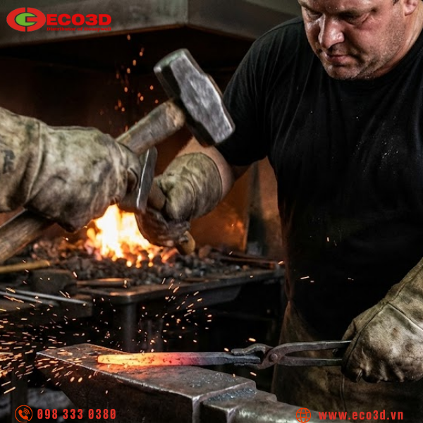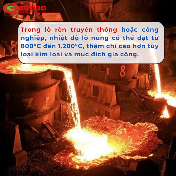 Trong lò rèn truyền thống hoặc công nghiệp, nhiệt độ lò nung có thể đạt từ 800°C đến 1.200°C, thậm chí cao hơn tùy loại kim loại và mục đích gia công. Phôi thép sau khi nung thường có nhiệt độ trên 600°C khi được đưa ra ngoài để rèn hoặc tạo hình. Đây là mức nhiệt đủ gây bỏng nặng nếu tiếp xúc trực tiếp chỉ trong thời gian rất ngắn.
