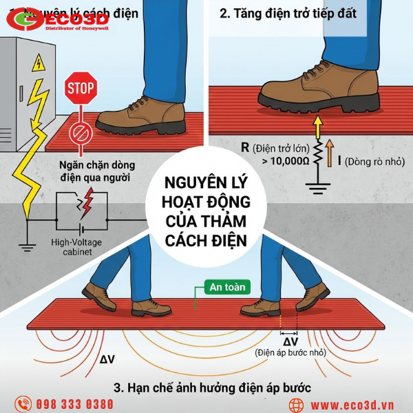 Thảm cách điện được sản xuất từ cao su kỹ thuật có khả năng chịu điện áp cao. Nguyên lý hoạt động rất đơn giản nhưng hiệu quả: ngăn dòng điện truyền từ thiết bị qua cơ thể người xuống đất. Khi kỹ thuật viên đứng trên thảm, một lớp cách ly an toàn được tạo ra giữa chân người thao tác và nền đất hoặc sàn kim loại.