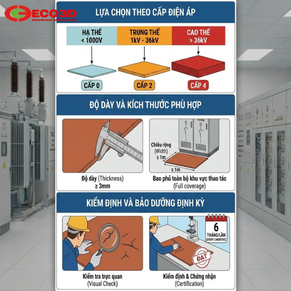 Thảm cách điện cần được chọn theo đúng cấp điện áp sử dụng, ví dụ 10kV, 15kV, 22kV hoặc 35kV. Việc chọn sai cấp điện áp có thể khiến khả năng bảo vệ không đạt yêu cầu. Do đó, cần căn cứ vào điện áp vận hành thực tế của trạm để lựa chọn phù hợp.